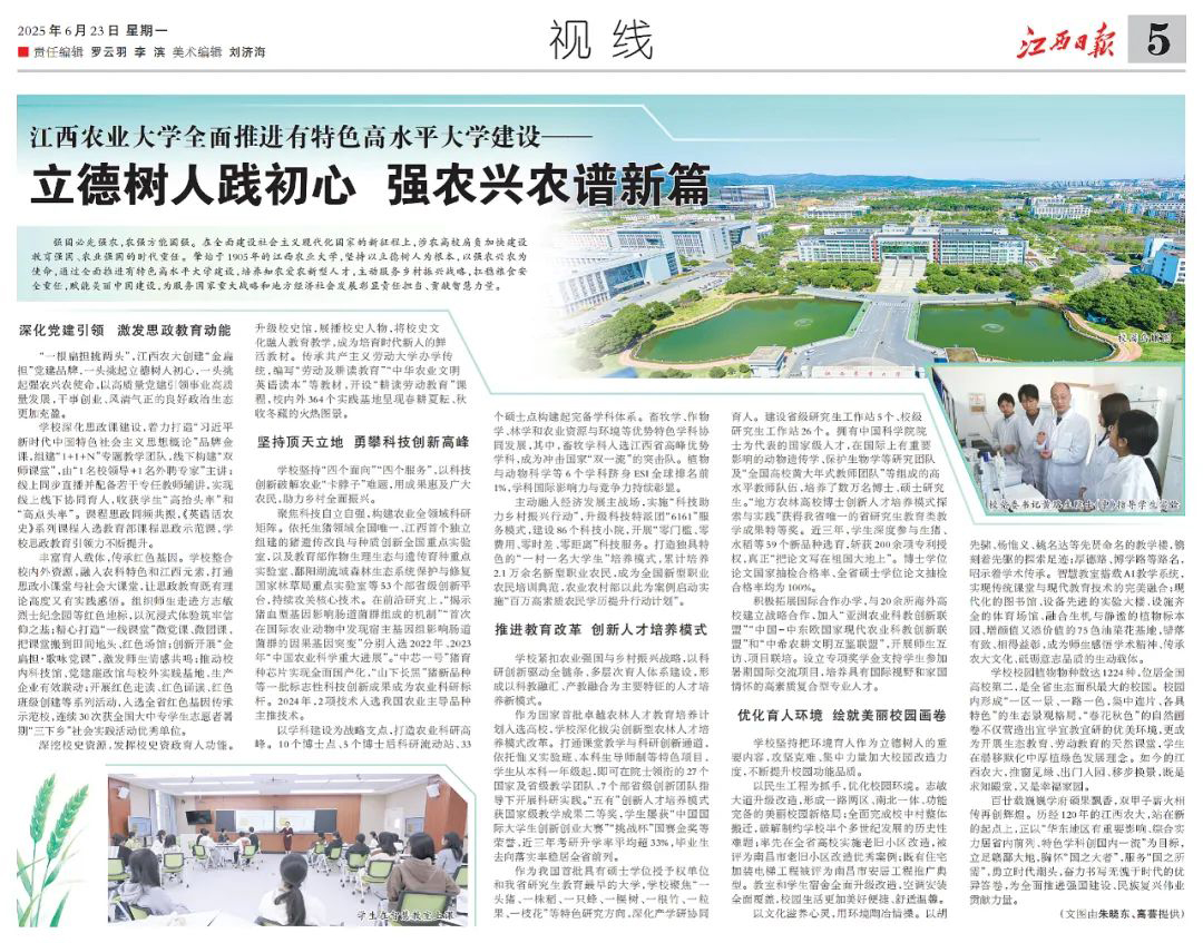 6月23日,《江西日报》以“立德树人践初心,强农兴农谱新篇”为题专题专版报道ac米兰全面推进有特色高水平大学建设成效,全文如下: