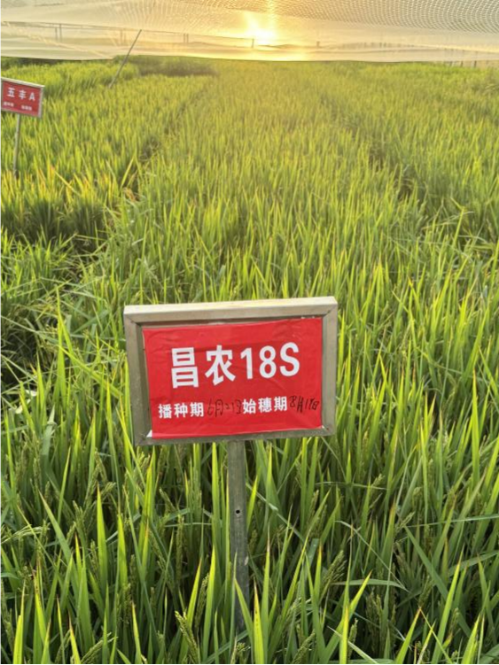 “昌农18S”不育系田间群体整齐一致,农艺性状稳定,株型适中,茎秆粗壮,叶色绿,剑叶挺直,稃尖紫色,柱头紫黑色,符合水稻两系不育系的育性要求。该不育系具有粒型长、品质优、茎秆韧性好等特点,适宜配多穗、剑叶挺拔类型恢复系。
