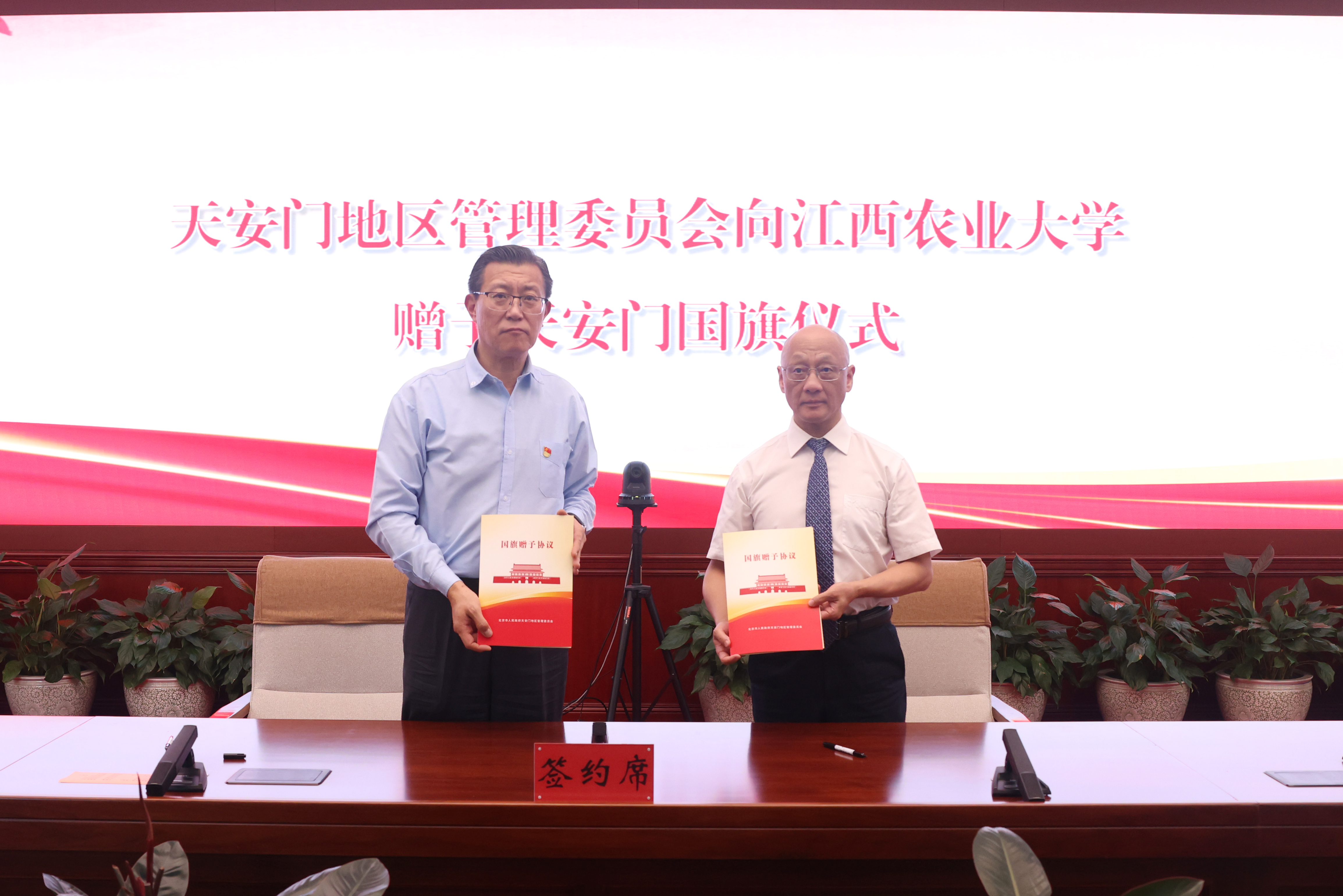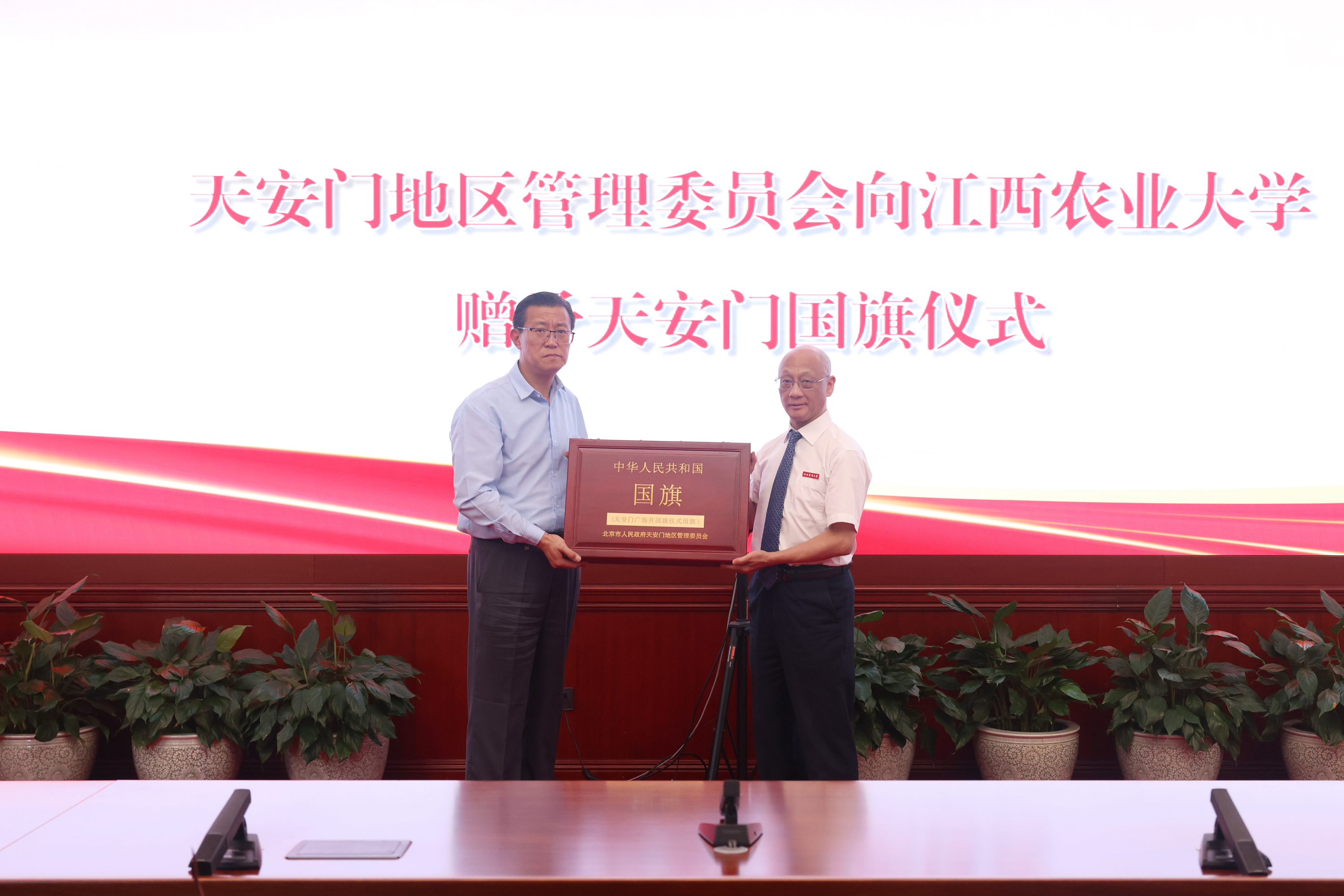 9月25日,北京市人民政府天安门地区管理委员会向ac米兰官网中文网站赠予天安门国旗仪式在京举行。天安门地区管委会党组成员、副主任姚辉向学校赠予国旗,校党委书记黄路生院士代表学校接收国旗,双方共同签署《国旗赠予协议》。学校获赠的国旗旗长5米、高3.3米,整幅旗面无拼接,五颗星采用人工丝网印染工艺,编号为2024-0325号,是ac米兰建校120周年倒计时一周年,即2024年11月20日在天安门广场升起的国旗。