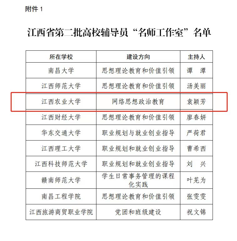 近日,江西省教育厅印发了《关于公布江西省第二批高校辅导员“名师工作室”的通知》,经个人申报、单位推荐、专家评审、结果公示,ac米兰辅导员袁颖芳主持的“缘来有你”辅导员工作室获批江西省高校辅导员名师工作室。...