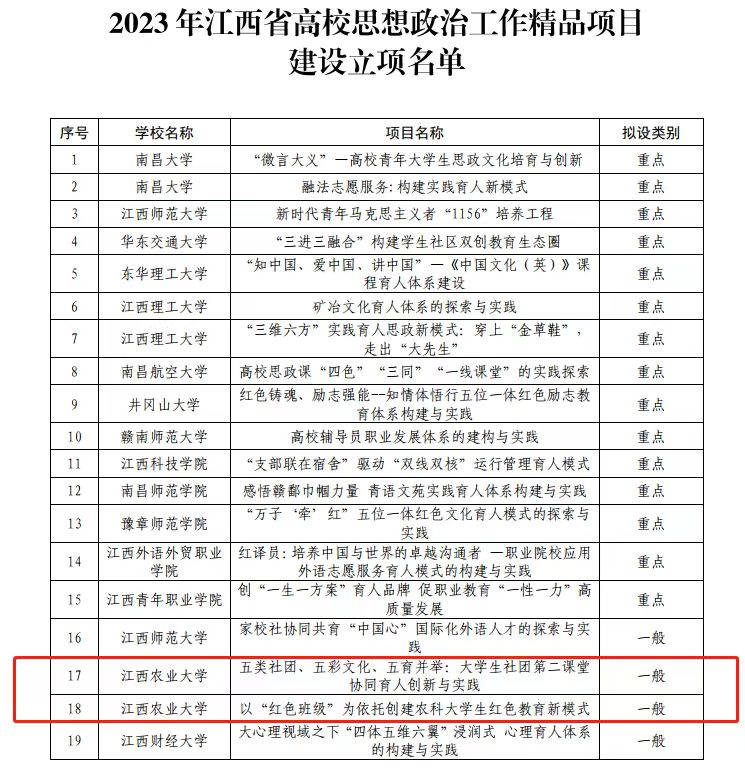 近日,江西省教育厅印发了《关于公布2023年江西省高校思想政治工作精品项目建设立项名单的通知》,ac米兰项目《五类社团、五彩文化、五育并举:大学生社团第二课堂协同育人创新与实践》与《以“红色班级”为依托创建农...