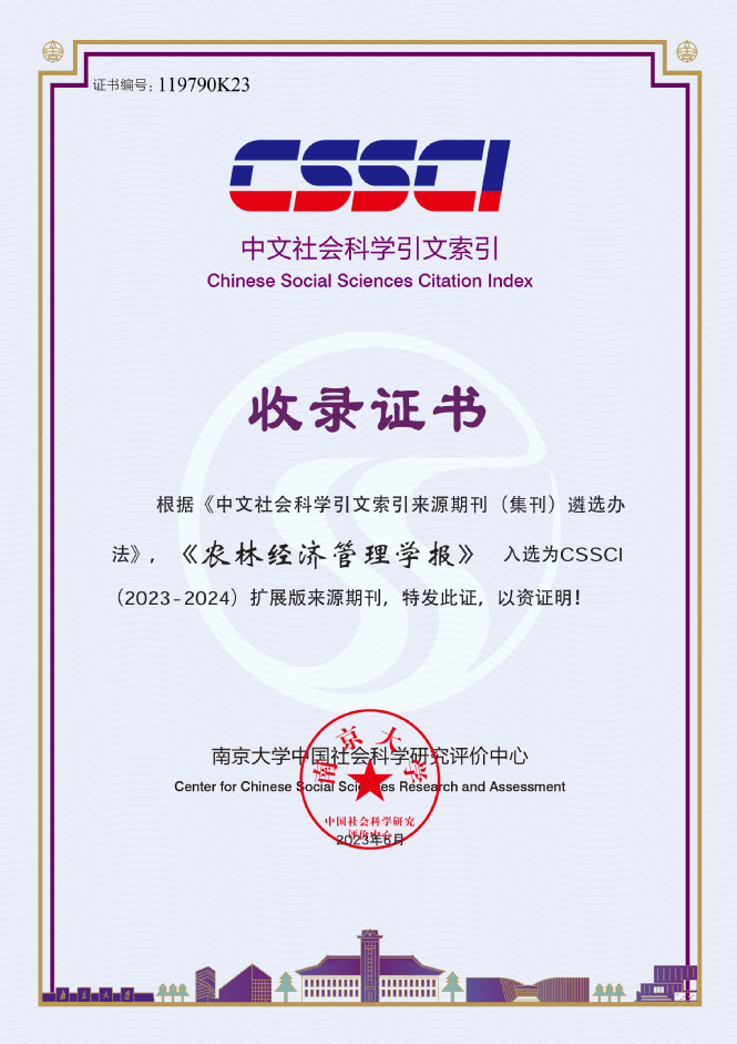近日,经南京大学中国社会科学研究评价中心(CSSCI)认证并颁发证书,《农林经济管理学报》入选CSSCI(2023—2024)扩展版来源期刊,这也是自2019年以来连续3次入选CSSCI扩展版来源期刊。同时,全国高等学校文科学报...