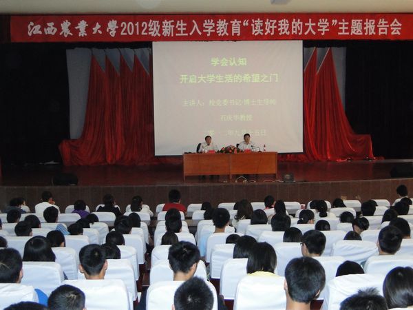 9月15日上午,校党委书记、博士生导师石庆华教授,在逸夫报告厅为2012级新生作题为《学会认知,开启大学生活的希望之门》的主题报告。来自全校各个学院的630余名新生代表聆听了报告。 石书记从认知社会、认知校情、...