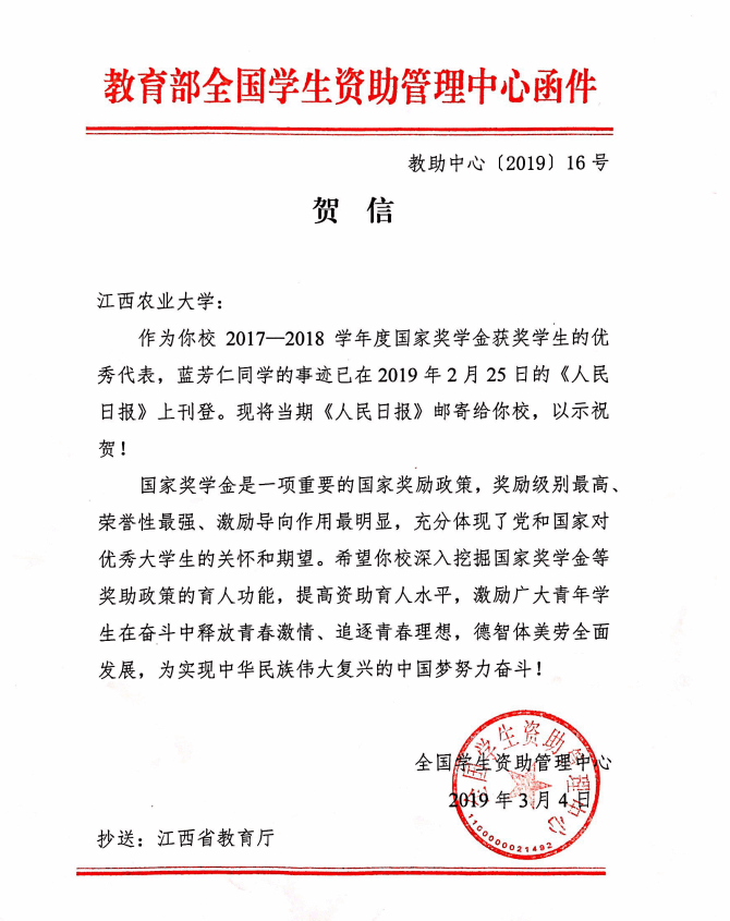 日前,教育部全国学生资助管理中心向ac米兰发来贺信,祝贺蓝芳仁同学获得2017-2018学年国家奖学金。作为国家奖学金获奖学生代表,蓝芳仁同学的优秀事迹已在2月25日的《人民日报》专版刊登。这是教育部全国学生资助管理...