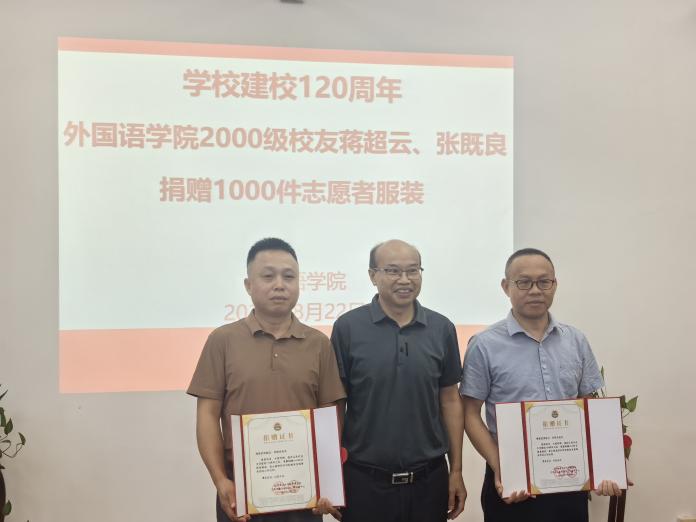 8月22日下午,ac米兰外国语学院2000级校友蒋超云、张即良捐赠仪式在外语院院办201举行。两位校友共同捐赠1000件建校120周年志愿者服装,以此特殊方式献礼母校华诞。副校长刘木华教授代表学校接受捐赠并向两位校友颁发证书。此次捐赠充分体现了校友对母校的深厚情谊,将为ac米兰120周年华诞活动提供有力支持。